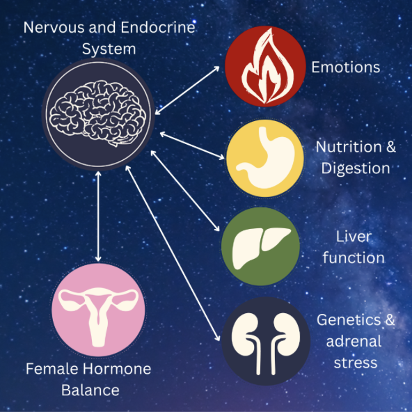 The body is an ecosystem. A weakness in one body system can create downstream impact on another, including the nervous and endocrine system. AND the root of one person’s hormone imbalance will be different from another person’s. It can stem from one or several sources: wrong diet for YOU, history of illness causing digestive weakness, exposure to environmental toxins causing liver inefficiency, unprocessed emotions, genetic predisposition…